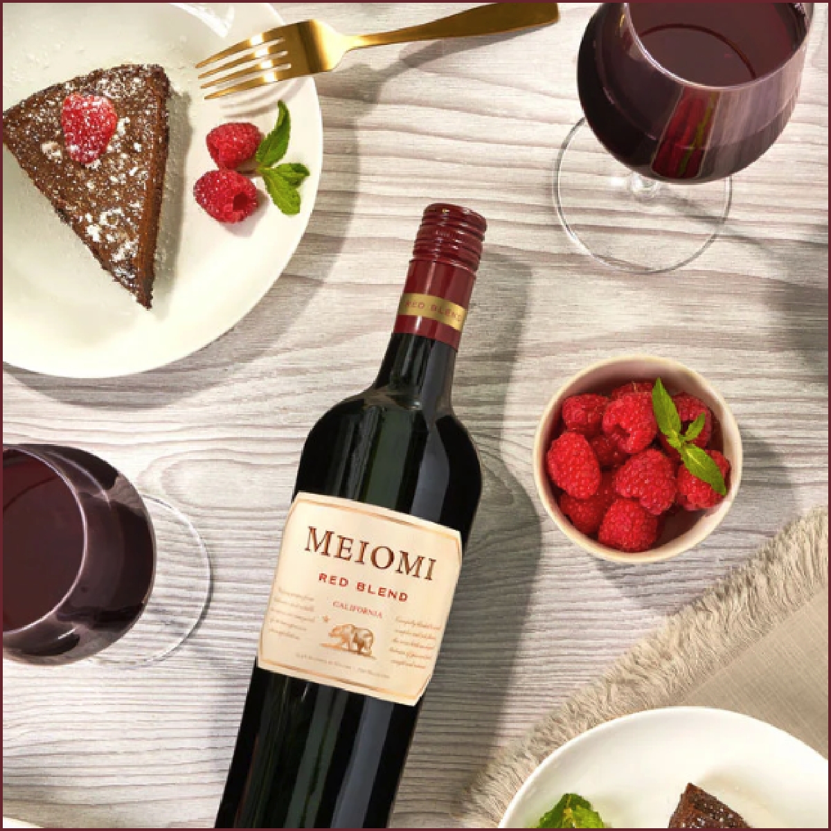 Spread the red wine chocolate ganache over the top of the cake. Place the cake in the refrigerator to settle for 2-4 hours. Once ready to serve, sprinkle with powdered sugar and top with fresh raspberries, blackberries, or red cherries. Garnish with fresh mint and star anise. Serve and enjoy with Meiomi Red Blend.
